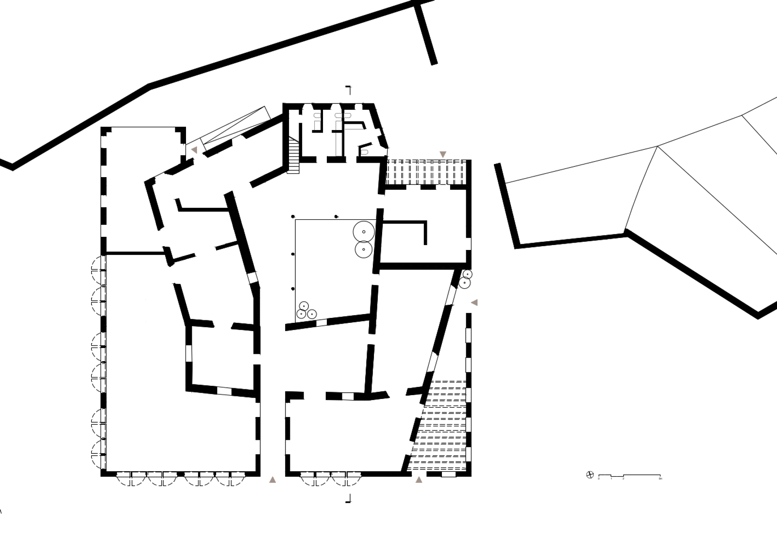 L’edificio si accomoda sul fianco della collina, come se appartenesse a quel luogo da sempre.