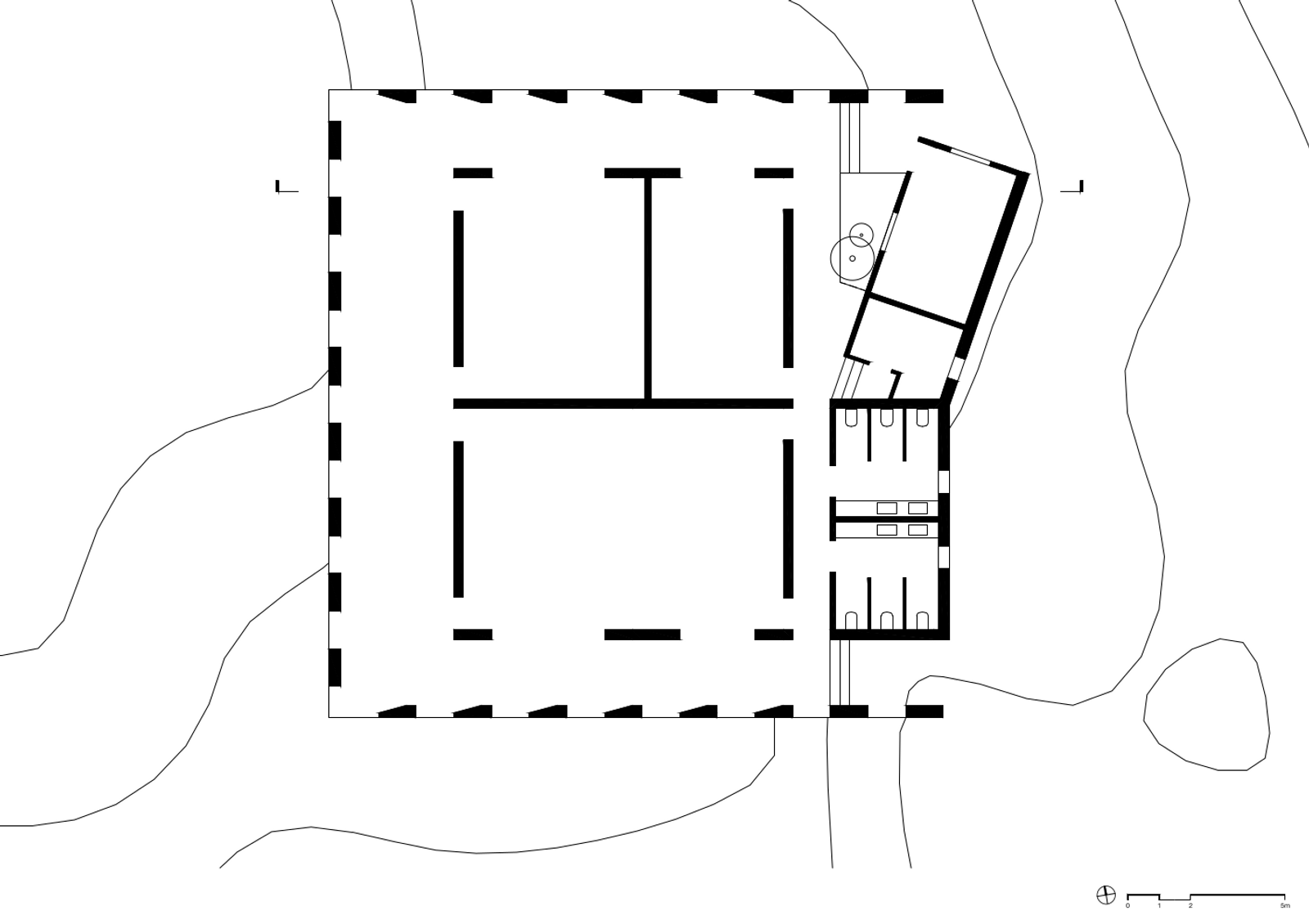Anche per l’auditorium si fa riferimento alla geometria del quadrato, che viene però addolcita dal rapporto con la topografia: l’edificio si accomoda sul fianco della collina, come se appartenesse a quel luogo da sempre, e restituisce il profilo del suolo grazie al tetto verde e alla struttura semi sommersa. I dislivelli naturali del pendio si trasformano in gradoni man mano che il visitatore procede attraverso il paesaggio ed abbracciano l’architettura.
