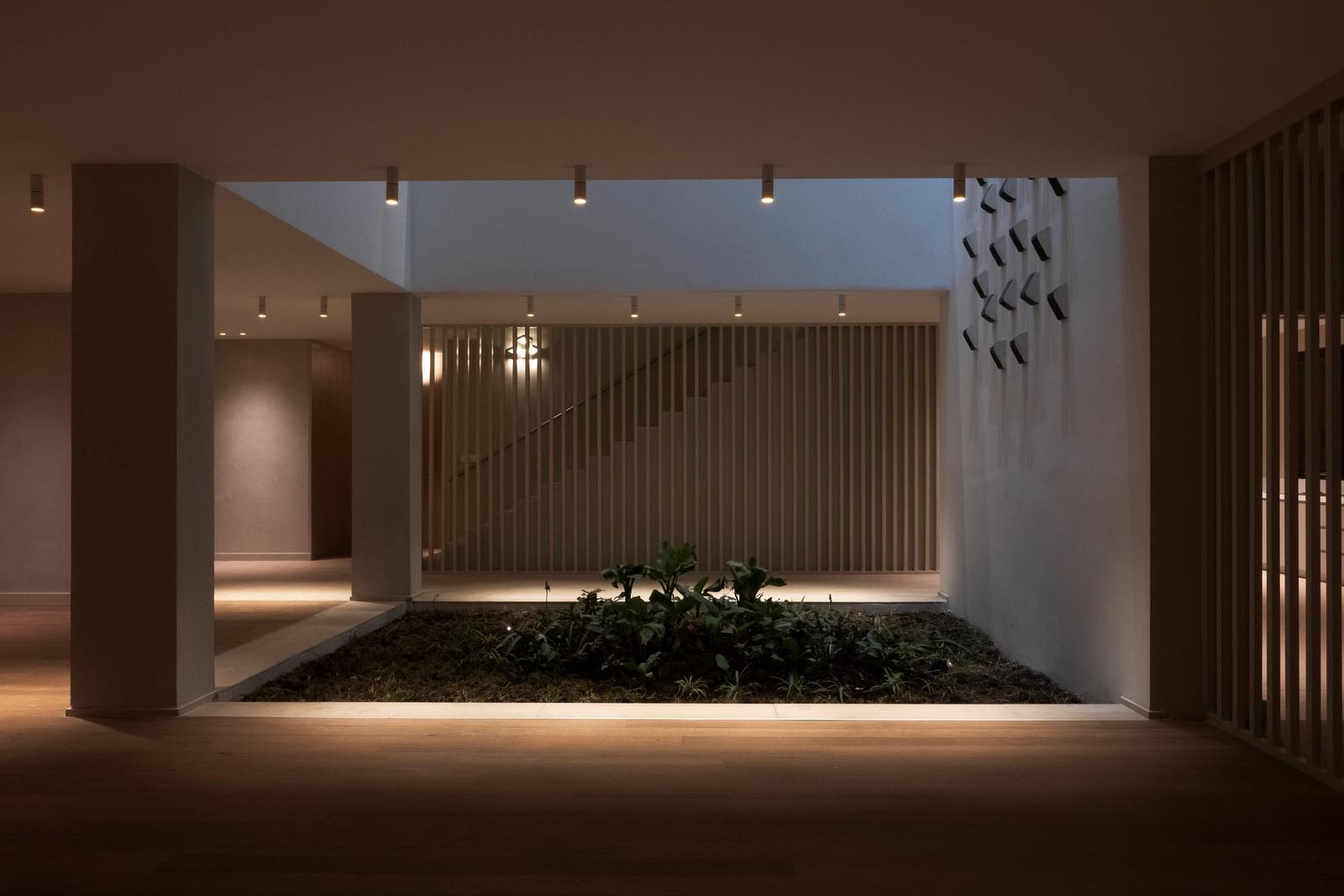 Al piano superiore c’è la zona notte: quattro ampie camere con bagno, più uno studio, ognuna dotata di una loggia privata con affaccio sul giardino. Al secondo piano si trovano la palestra e due grandi terrazze servite da un’ampia cucina attrezzata. Lungo tutto il perimetro dell’edificio, per ammorbidire le linee rigide del volume, sono state inserite delle fioriere in muratura con vegetazione locale che ricade delicatamente sulla facciata. Entrambi i piani superiori si affacciano su una corte centrale, adibita a giardino d’inverno e coperta da un grande lucernario: questo permette l’ingresso di luce naturale fin nelle parti più centrali della villa, con la possibilità di schermare la luce diretta zenitale nelle ore più calde grazie a dei velari meccanici.